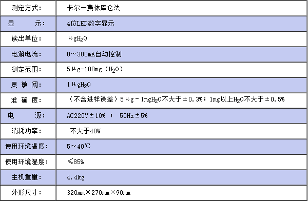 儀器符合GB/T7600;SH/T0246;GB/T606及采用卡爾—費休法測定樣品中水分的有關標準。儀器采用了先進的自動控制電路,電